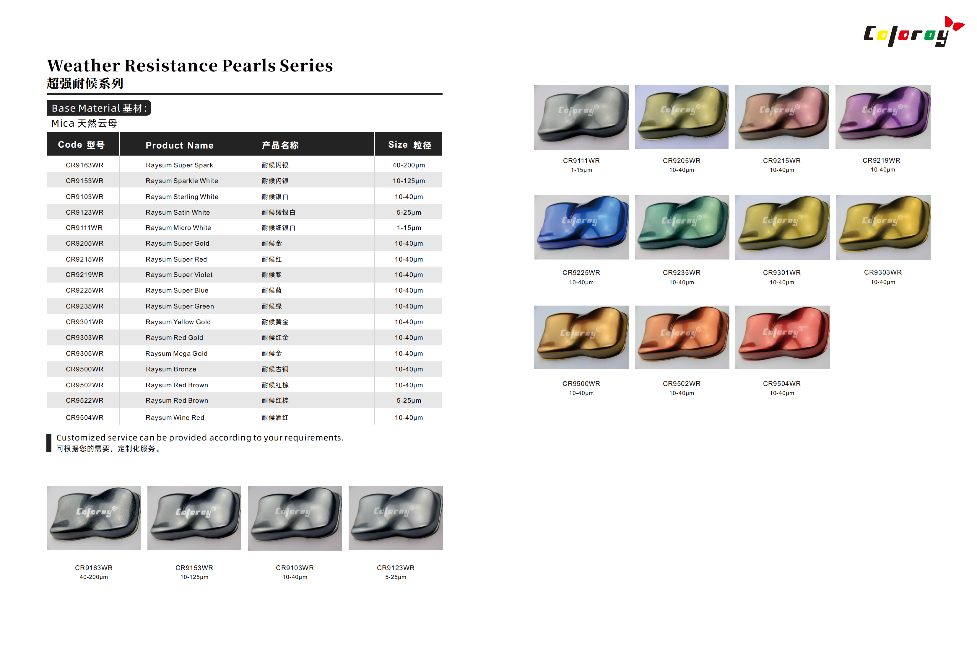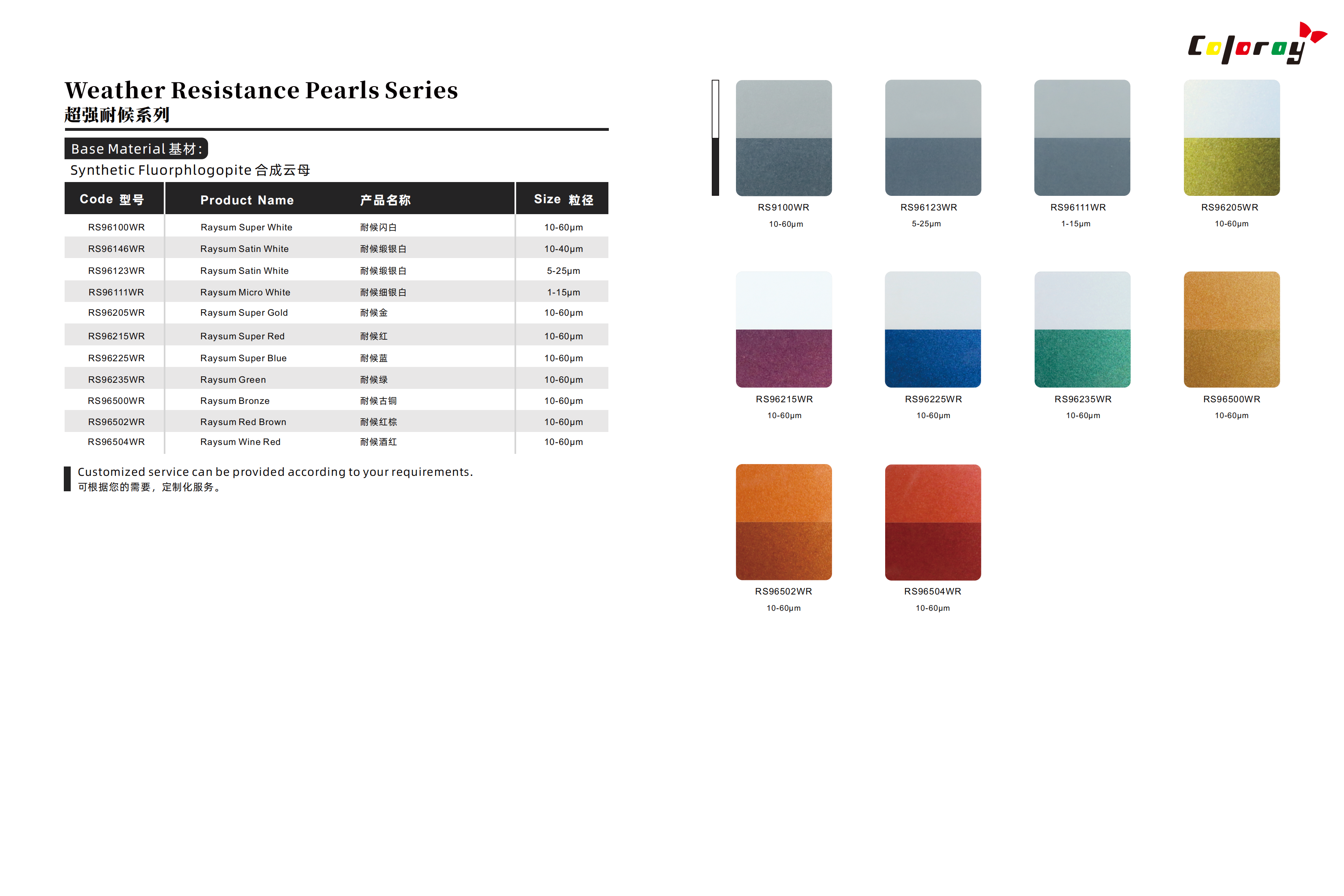 Coloray стремится обеспечить цвет Пользователи с целым рядом пигментов эффектов с выдающейся производительностью, стабильностью и партийной консистенцией; Иметь профессиональную техническую поддержку и конкурентоспособность цен. Будь то косметика, покрытия, Пластмассы, печатные чернила, кожа или строительная отрасль, Coloray-поставщик и долгосрочный Партнер многих международных брендов, обеспечивая постоянное качество и уникальные результаты. Ли Выбор текущего продукта из нашего руководства по продукту или поиск индивидуальной услуги, свяжитесь с нас. Наша опытная команда сделает все возможное, чтобы удовлетворить ваши требования и удовлетворить вас. С качеством, Сильная техническая поддержка и комплексные услуги, Coloray - ваш партнер.
